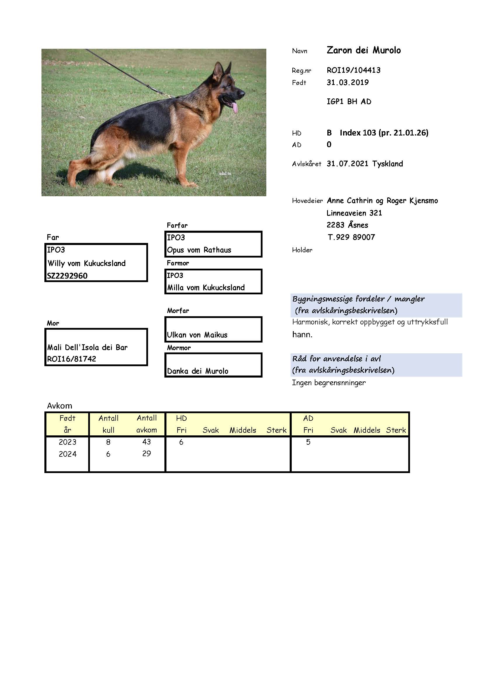 Avlskårede norskeide hannhunder som står i Norge, og som har hatt min. 1 kull.