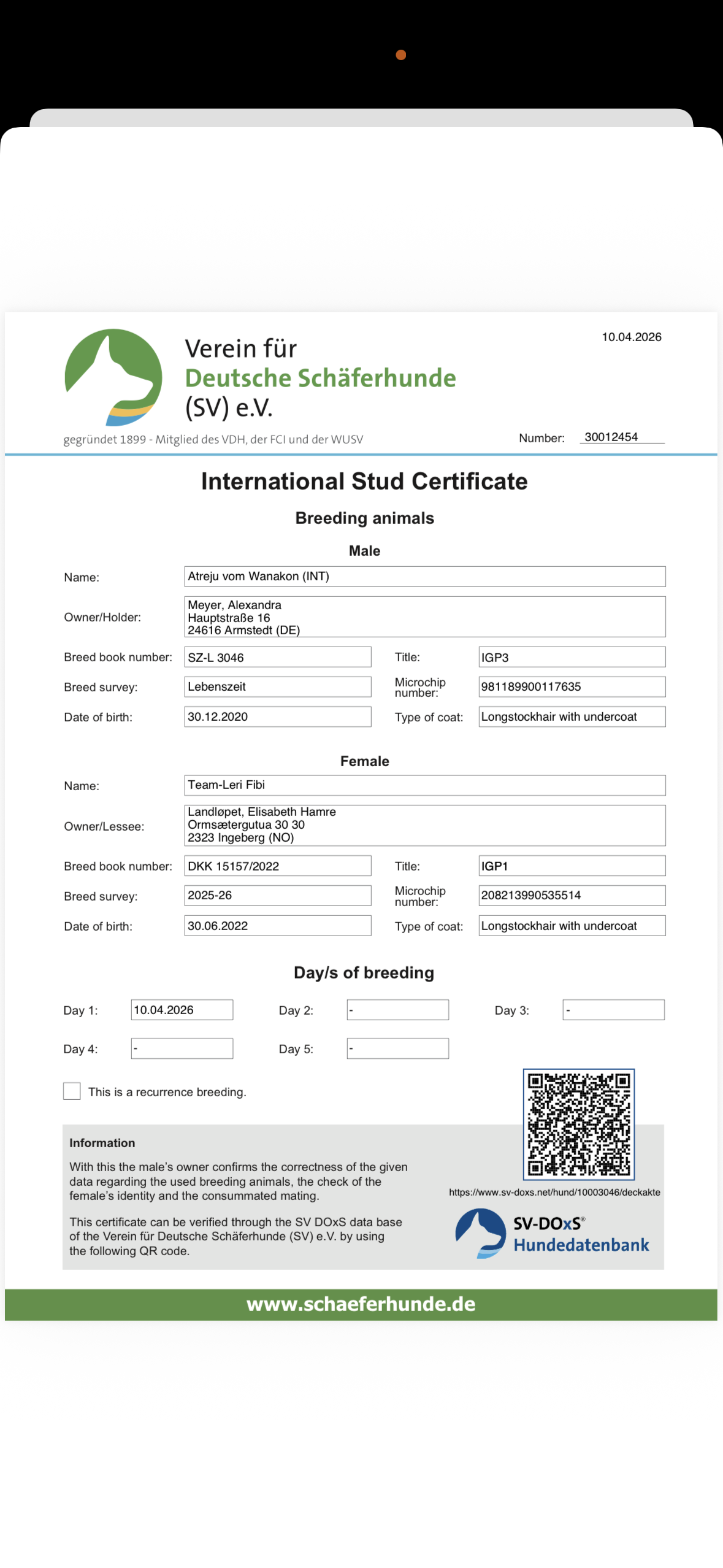 | Egne kommentarer: | Begge foreldrene er utvalgt med fokus på helse, mentalitet, arbeidskapasitet og rasetypiske egenskaper. Amanda er en trivlig og stabil tispe med et særdeles godt gemytt, hun fungerer utmerket godt i hverdagen og på treningsbanen hvor hun har god energi. Landgraf er en flott hannhund med solid arbeidskapasitet, godt temperament, stabil og med en spennende stamtavle. |